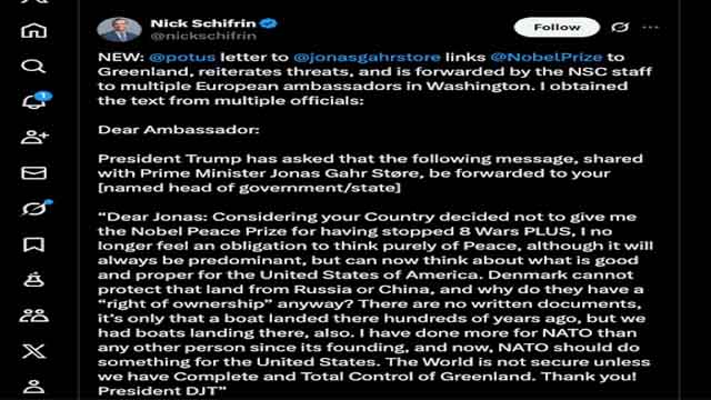 নরওয়ের গণমাধ্যম ভিজি এক প্রতিবেদনে জানিয়েছে, নোবেল না পাওয়ার কারণেই ট্রাম্পের রুদ্রমূর্তি দেখছে বিশ্ব। দেশটির প্রধানমন্ত্রী ইয়োনাস গার স্টোরকে একটি চিঠি পাঠিয়েছিলেন ট্রাম্প। সেখানে মার্কিন প্রেসিডেন্ট গ্রিনল্যান্ড দখলের হুমকিও দিয়েছিলেন।